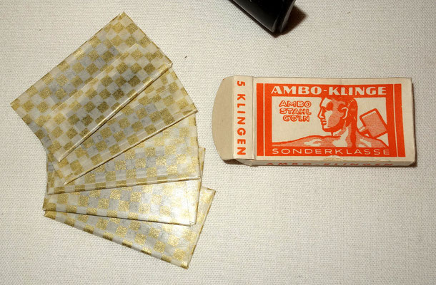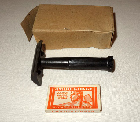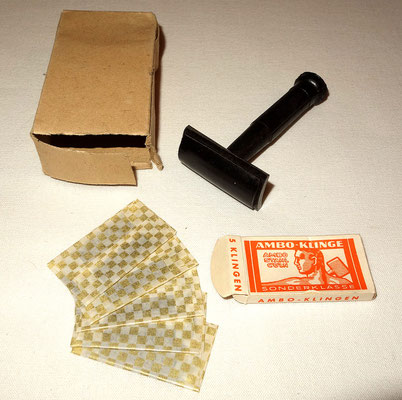 Rasoir en bakélite + carton d’emballage + 5 lames neuves.
