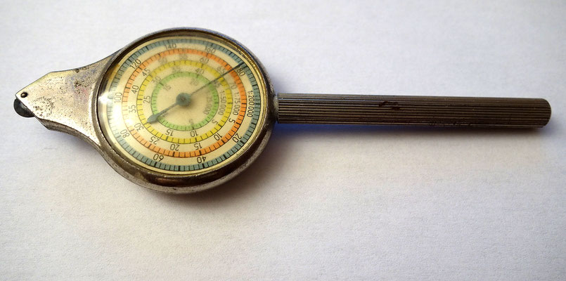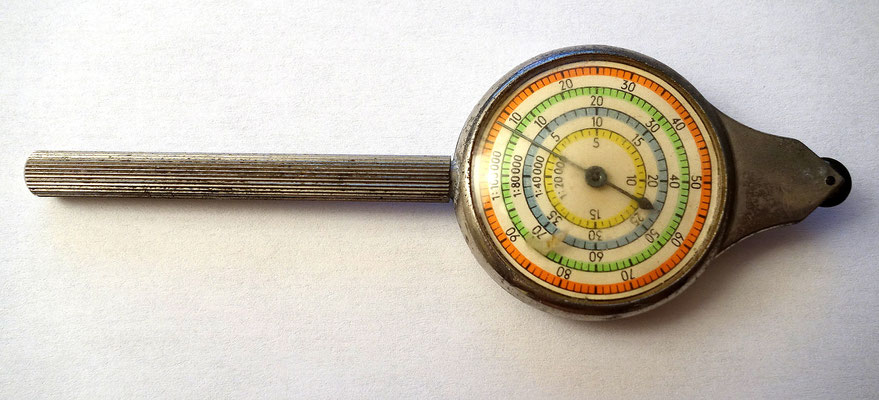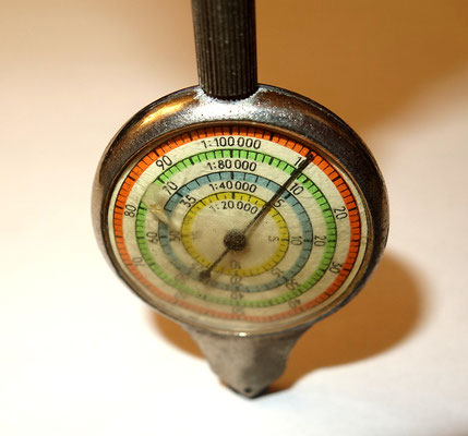 Constitué d'une roulette reliée par le biais d'un engrenage à un cadran indicateur présentant plusieurs échelles de distances. Il suffit de suivre le cheminement d'une route à l'aide de la roulette et de lire la valeur indiquée par l'aiguille sur le cadran.