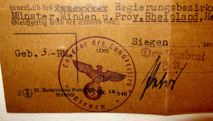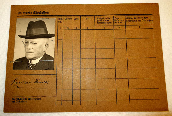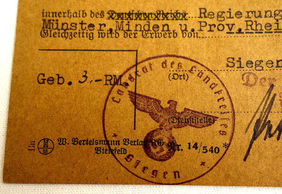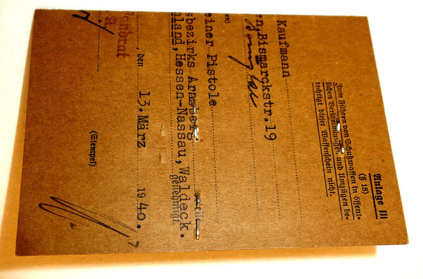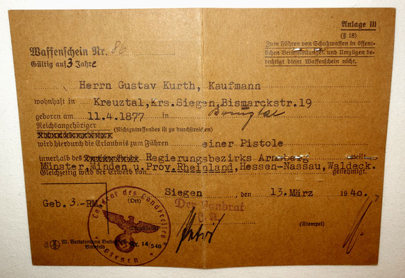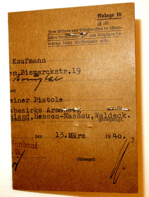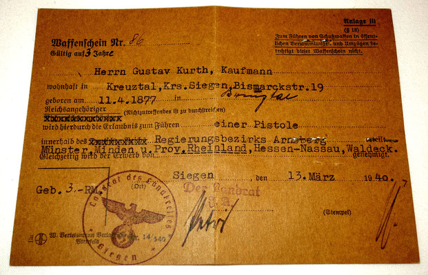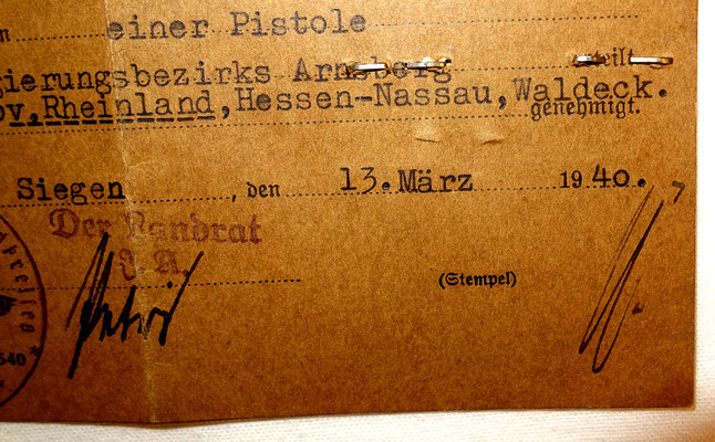 Document très rare (!) : le permis de port du pistolet délivré à un civil, ce qui doit être un cas très particulier, car, d’une manière normale, le port d’arme à poing par des civils a été interdit sous le IIIème Reich.