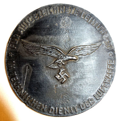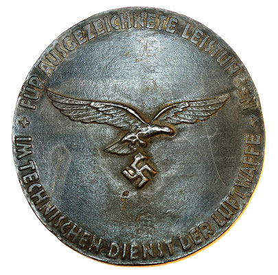 Le verso est avec l’aigle LW et le marquage « FÜR AUSGEZECHNETE LEISTUNGEN * IM TECHNISCHEN DIENST DER LUFTWAFFE* » / « POUR LES RESULTATS EXCEPTIONELLS DANS LE SERVICE TECHNIQUE DE LA LUFTWAFFE ».