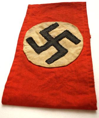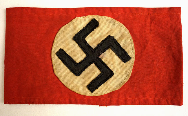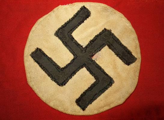 La confection des débuts de la NSDAP. Cela pourrai être une contrefaçon, mais ce n’est pas le cas : il existe des copies à perfusion à des prix dérisoires qui sont neuves, mais parfaitement conformes aux modèles règlementaires ; cet exemplaire est cousu par le porteur, un travail aussi maladroit que très laborieux – pratique répondue dans les débuts de mouvement nazi.